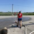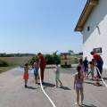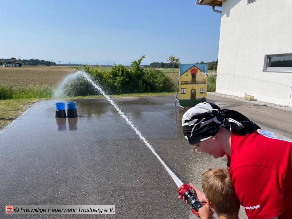 Währenddessen wurde draußen schon alles aufgebaut. Da heute das Wetter perfekt mitspielte, wurde der Düsenschlauch, das Hydroschild und die Spritzwand aufgebaut. Ebenso durften die Kinder mit einem Strahlohr auf zwei Eimer zielen und diese um "löschen"!