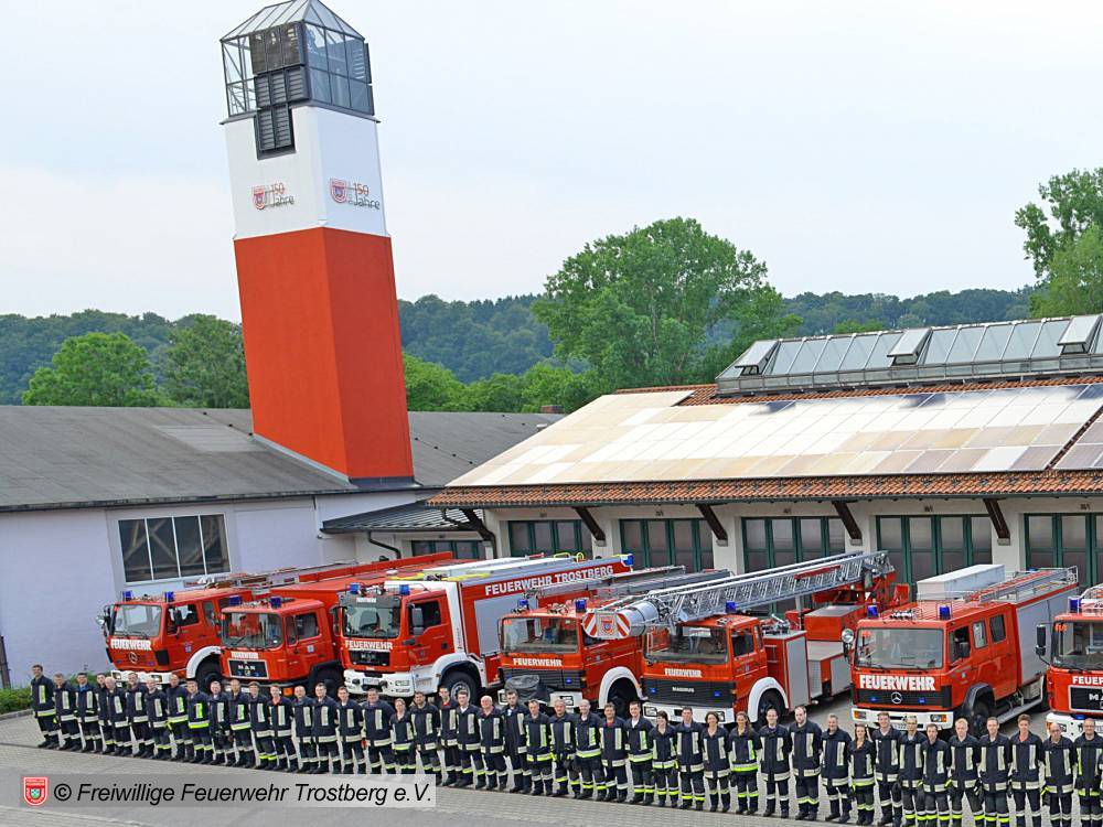 BU1: Ein beeindruckendes Bild geben die Aktiven, die Fahrzeuge und die Feuerwache der Freiwilligen Feuerwehr Trostberg ab. Die Stützpunktfeuerwehr ist eine der modernsten Truppen im Landkreis. Ein Grundstein dafür war der Bau der neuen Feuerwache an der Tittmoninger Straße, die 1986 eingeweiht wurde.