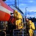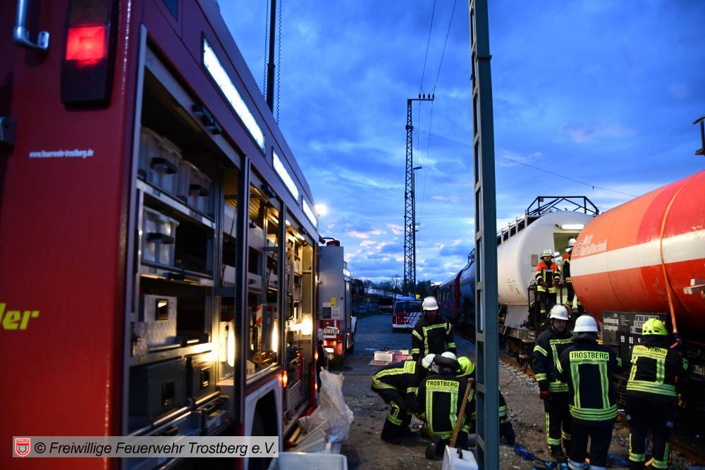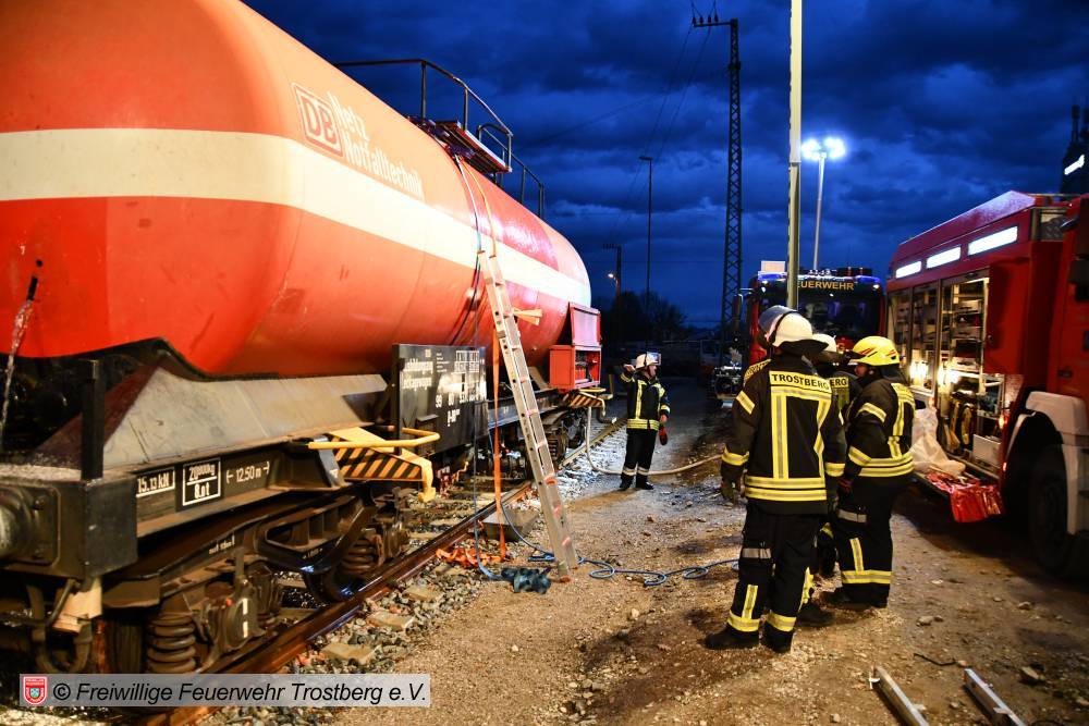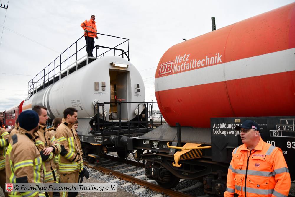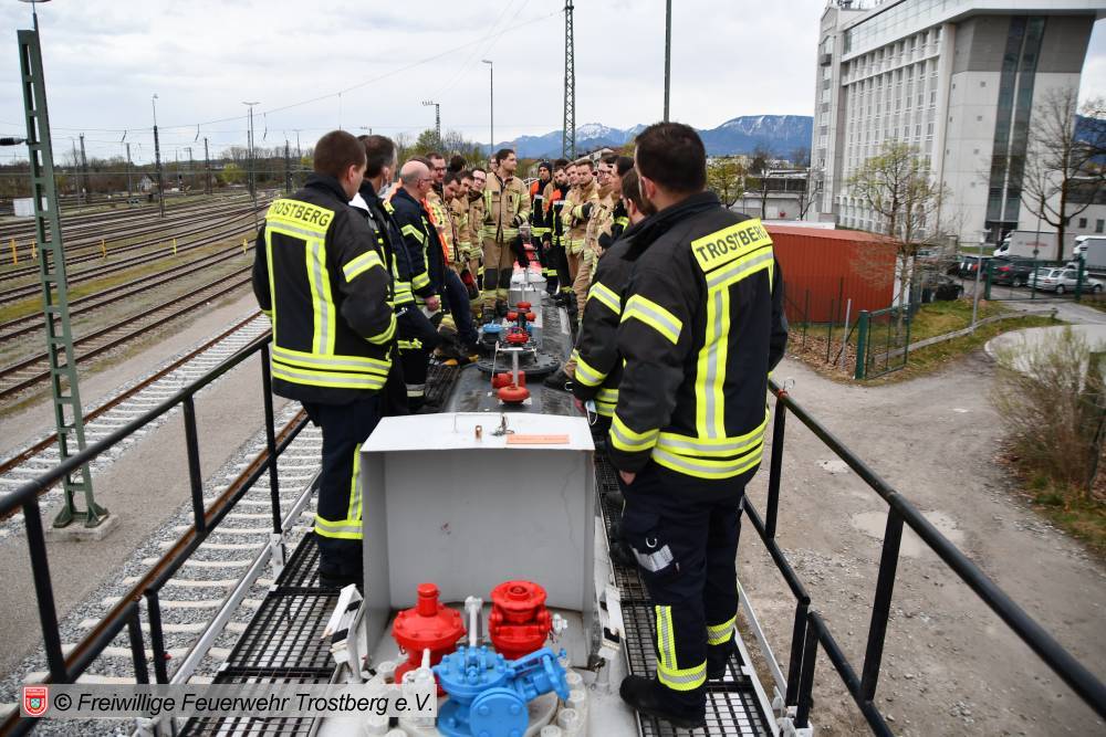 Am 7. April fand am Bahnhof in Rosenheim eine Ausbildung am Gefahrgut Ausbildungszug der DB Netz AG statt. An diesem können Feuerwehren den praktischen Umgang mit Leckagen an Kesselwagen trainieren. Der Ausbildungszug besteht aus 4 Waggons und ist der einzige seiner Art in Deutschland. Die Weiterbildung gliedert sich in drei Teile. Zunächst wird mit einer theoretischen Unterweisung durch Schulungsleiter Uwe Lindenberg begonnen. Hier werden spezifische Kenntnisse des Gefahrguttransports auf der Schiene vermittelt. Zweite Station ist der Ausbildungskesselwagen. Dieser ist eine Spezialanfertigung aus drei verschiedenen Kesselwagentypen. Hier sind insgesamt 65 verschiedene Armaturen und Sicherheitsventile verbaut. Beim dritten Teil der Ausbildung wird es dann praktisch. Ein eigens vorbereiteter Kesselwagen bietet 9 verschiedene Leckagen, die es erfolgreich abzudichten gilt.