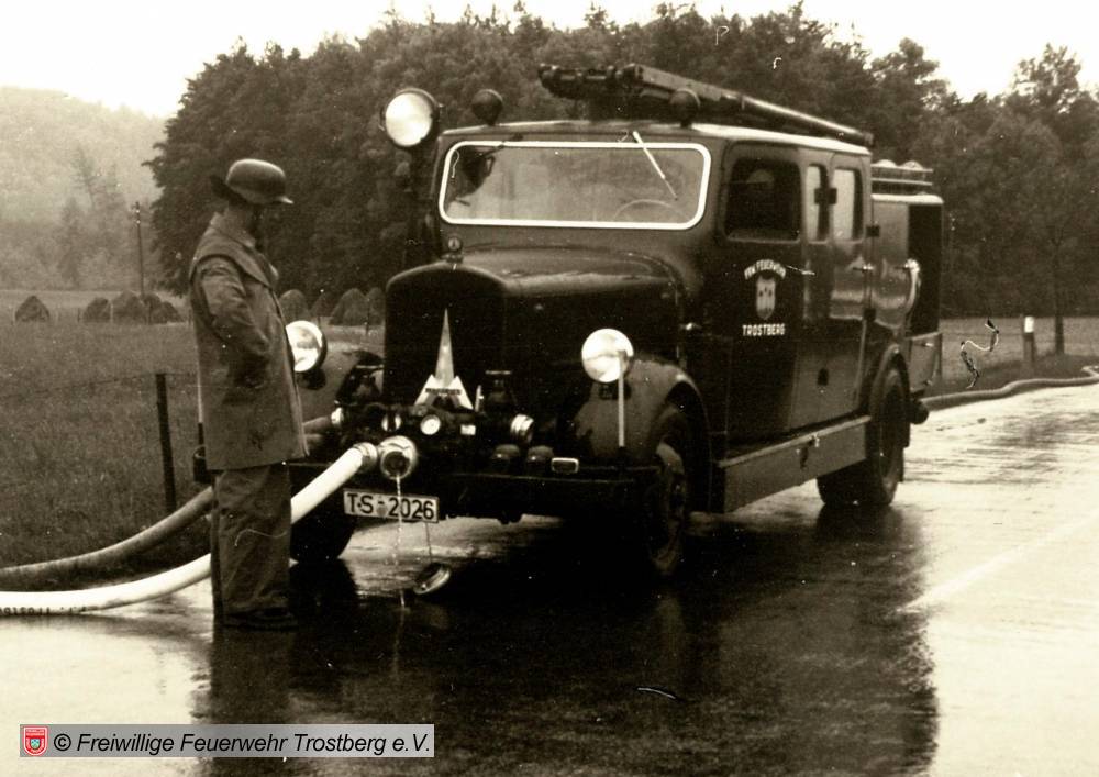 LF mit einer vor dem Fahrzeugkühler gelagerten Magirus-Feuerlösch-Kreiselpumpe Typ „P IVv“ mit einer Leistung von 1200 l/min