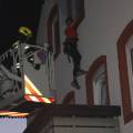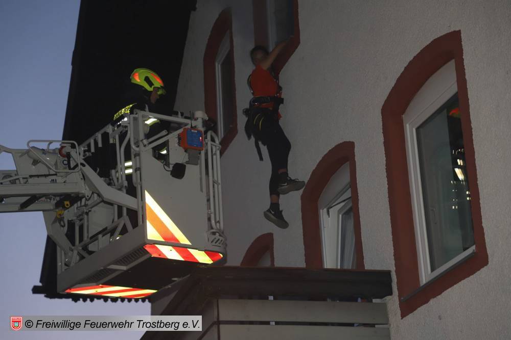 Zur Personenrettung aus dem ersten Stockwerk kamen Steckleitern zum Einsatz, aus dem Dachgeschoss musste zwei Personen mit Drehleitern gerettet werden. Die Menschenrettung entwickelte sich - völlig unerwartet - zu einer spektakulären Situation, da die Darsteller mit ihren realitätsgetreu geschminkten Verletzungen auch aus verschiedenen Fenstern kletterten, um sich vor dem Feuer in Sicherheit zu bringen. Diese brenzlige Situation musste von den beteiligten Helfern mit viel Fingerspitzengefühl sowie schnellem Handeln beseitigt werden. Damit den „Schauspielern“ nichts passiert, wurden sie zuvor eigens mit einer doppelten Absturzsicherung gesichert.