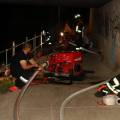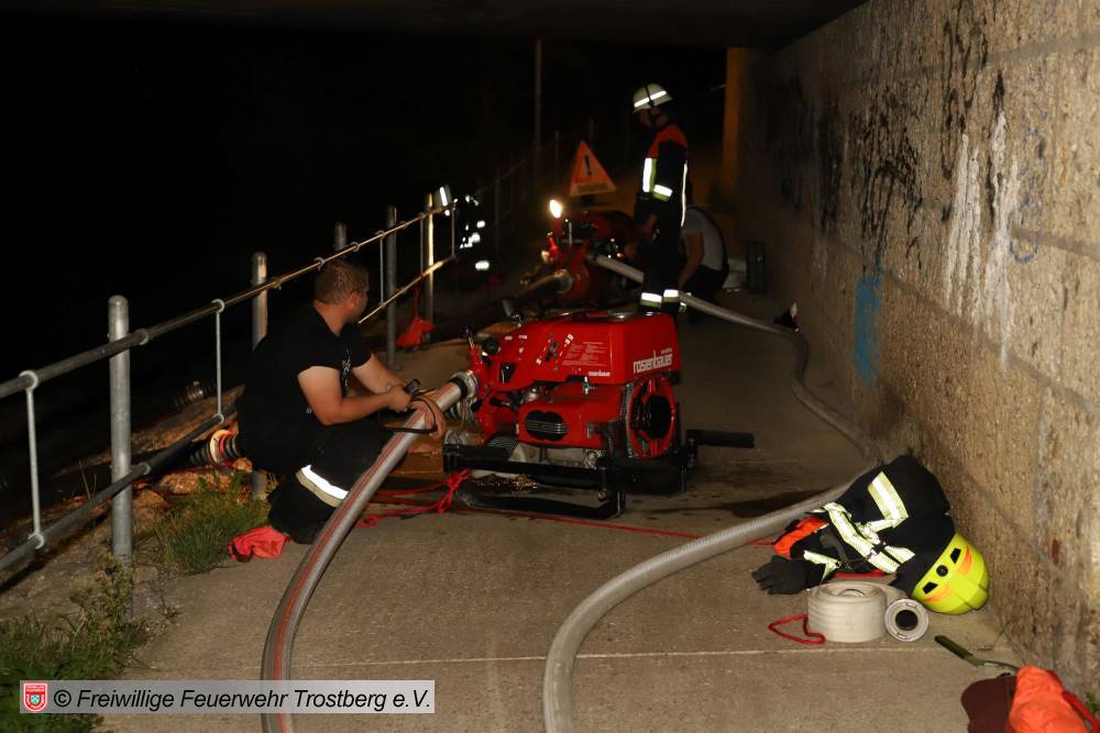 Die „Wasserentnahme und -Fortleitung“ bildete einen weiteren Übungsschwerpunkt. Hier kamen zwei tragbare Feuerlöschkreiselpumpen zum Einsatz, um das benötigte Löschwasser aus der nahegelegenen Alz, unter anderem über eine Schlauchüberführung einer Straße, an die Übungsstelle zu pumpen. Da eine ausreichende Wasserversorgung in Brandfällen dieser Größenordnung von entscheidender Bedeutung ist, wurde sowohl die Fördermenge als auch die Kommunikation der Einsatzkräfte über die gesamte Distanz auf die Probe zu stellen.
