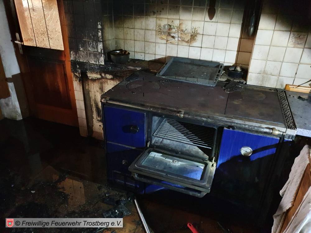 Brand in einer Küche. Feuer mit 1 C-Rohr unter Atemschutz gelöscht und Gebäude im Anschluss belüftet.
