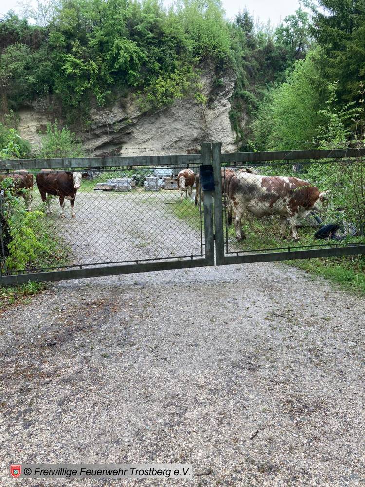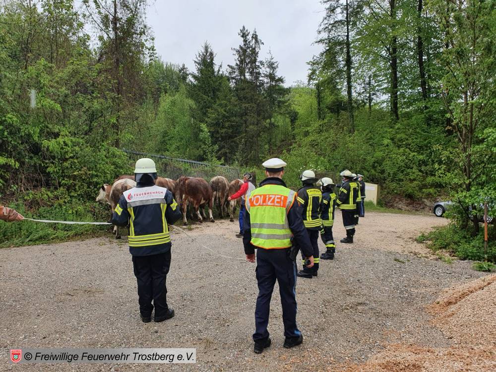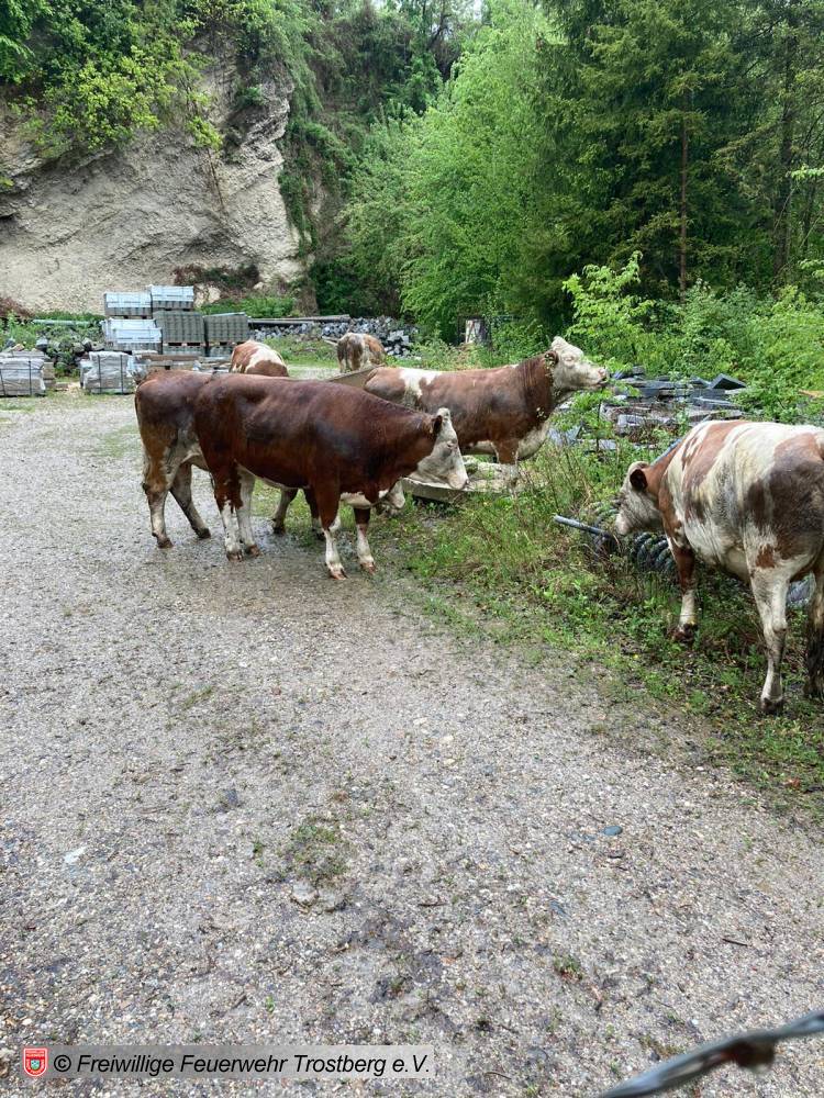 Viehanhänger mit 7 Kühen an der Kreuzung umgestürzt. Umleitung eingerichtet, Tiere gesichert und Fahrbahn gereinigt.
