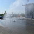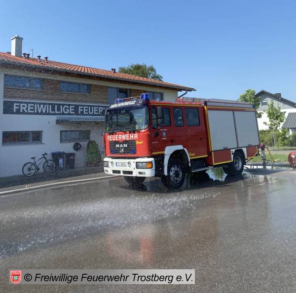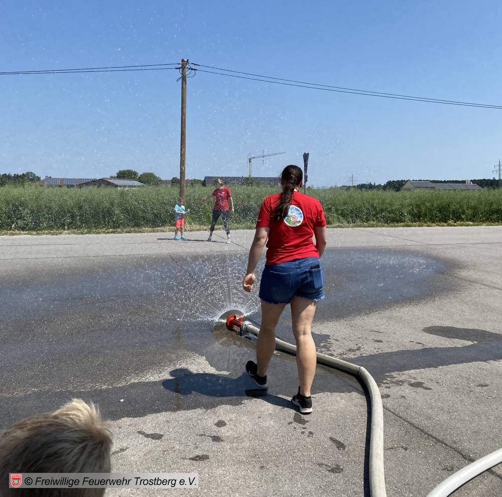 Währenddessen wurde draußen schon alles aufgebaut. Da heute das Wetter perfekt mitspielte, wurde der Düsenschlauch, das Hydroschild und die Spritzwand aufgebaut. Ebenso durften die Kinder mit einem Strahlohr auf zwei Eimer zielen und diese um "löschen"!