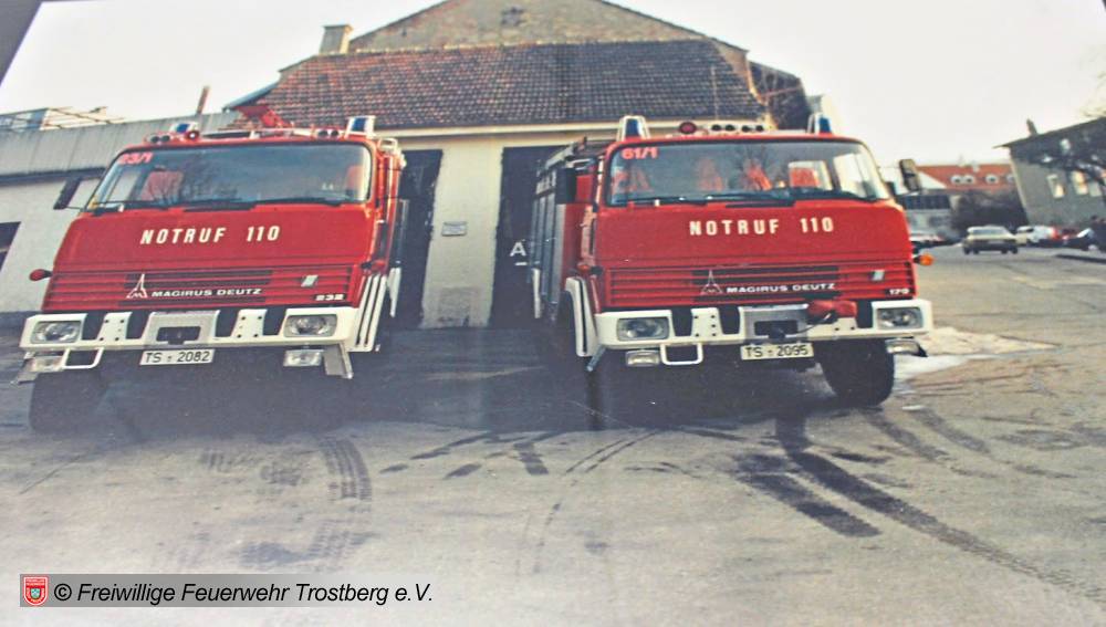 BU2: Vor dem Bau der neuen Feuerwache Mitte der 1980er Jahre waren die Fahrzeuge der Trostberger Feuerwehr in drei verschiedenen Gebäuden in drei Stadtteilen untergebracht (von oben): im eigentlichen Feuerwehrhaus in Schedling, wo sich damals auch die Polizeiinspektion befand, in den Garagen beim Haringer am Caroplatz und in einer Garage in der Schwarzau. Die Koordinierung der Einsätze war damals sehr schwierig: Die einzelnen Trupps wussten nicht, ob auch die anderen ausgerückt sind.