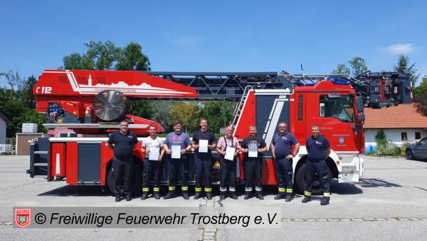 An den vier Vollzeit-Tagen wurden die fünf Maschinisten im Umgang mit unserer Drehleiter von Ausbilder Michael Hinz geschult und haben den Lehrgang erfolgreich abgeschlossen . Ab sofort besitzen sie die Qualifikation das Hubrettungsgerät in Übung und Einsatz zu fahren und zu bedienen.