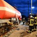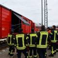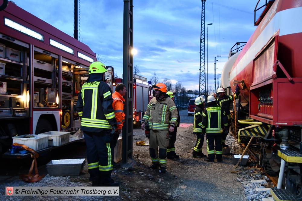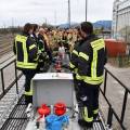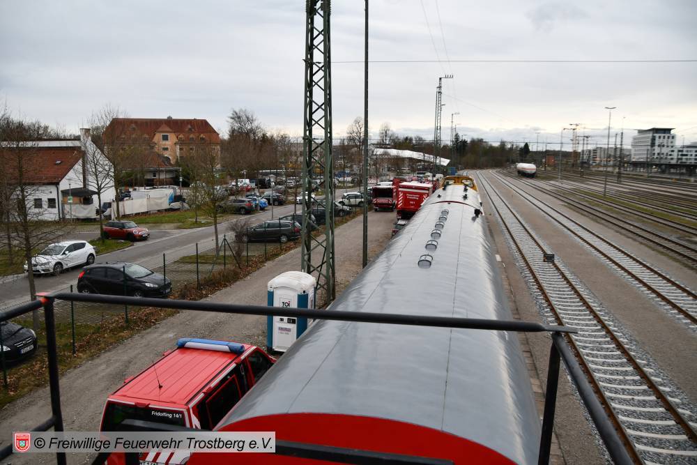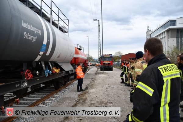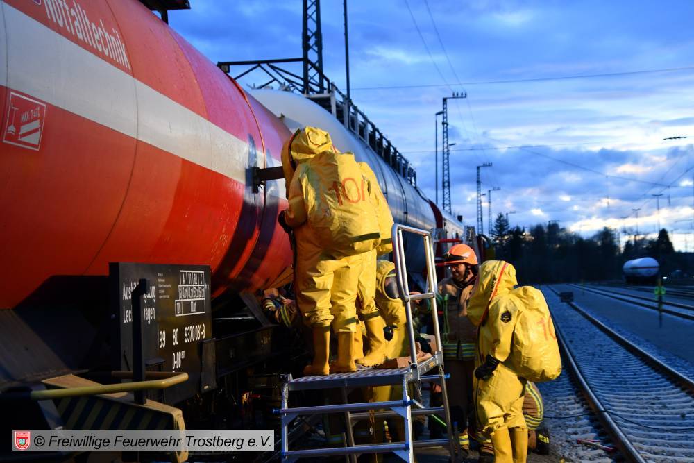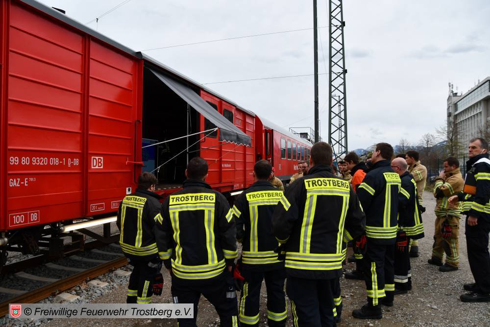 Am 7. April fand am Bahnhof in Rosenheim eine Ausbildung am Gefahrgut Ausbildungszug der DB Netz AG statt. An diesem können Feuerwehren den praktischen Umgang mit Leckagen an Kesselwagen trainieren. Der Ausbildungszug besteht aus 4 Waggons und ist der einzige seiner Art in Deutschland. Die Weiterbildung gliedert sich in drei Teile. Zunächst wird mit einer theoretischen Unterweisung durch Schulungsleiter Uwe Lindenberg begonnen. Hier werden spezifische Kenntnisse des Gefahrguttransports auf der Schiene vermittelt. Zweite Station ist der Ausbildungskesselwagen. Dieser ist eine Spezialanfertigung aus drei verschiedenen Kesselwagentypen. Hier sind insgesamt 65 verschiedene Armaturen und Sicherheitsventile verbaut. Beim dritten Teil der Ausbildung wird es dann praktisch. Ein eigens vorbereiteter Kesselwagen bietet 9 verschiedene Leckagen, die es erfolgreich abzudichten gilt.