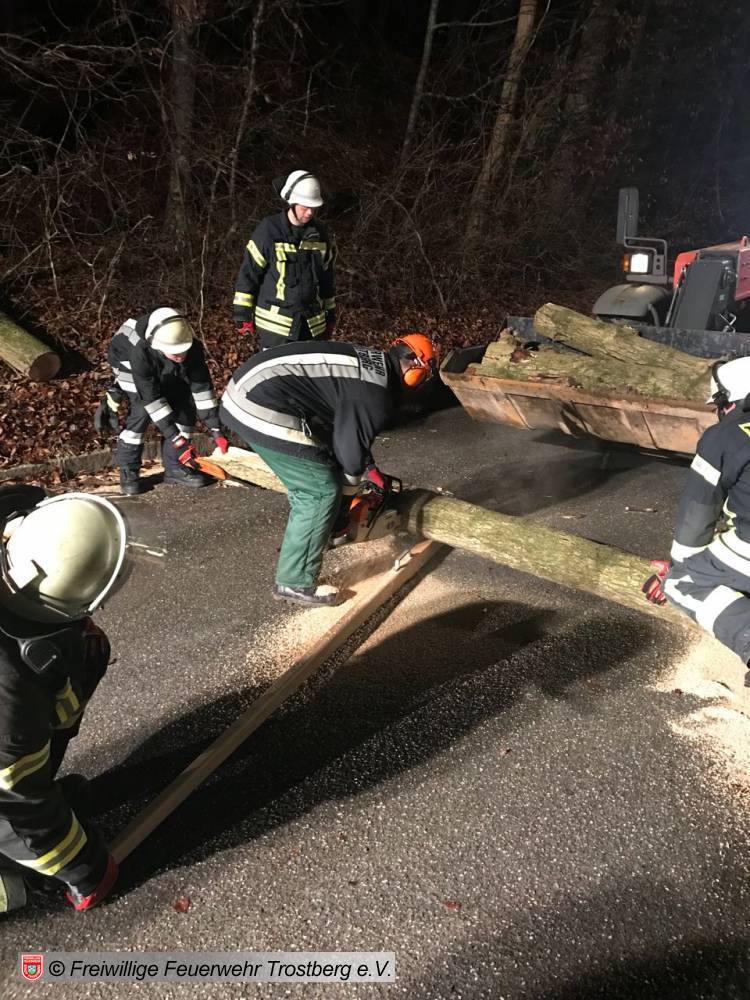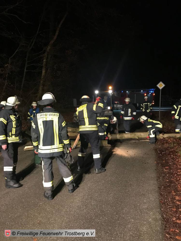 Baum quer über der Fahrbahn. Wurde durch die Feuerwehr beseitigt.