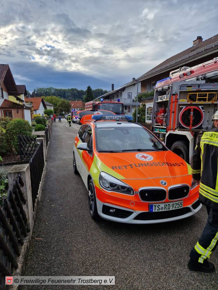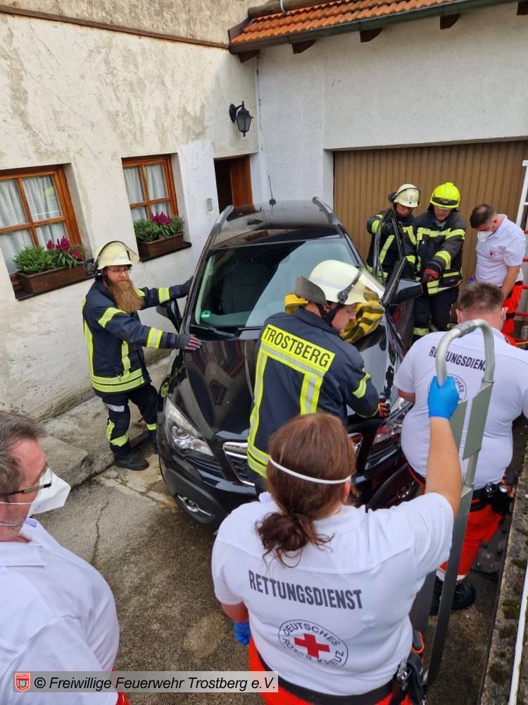 Person in Einfahrt unter PKW Türe eingeklemmt. Person befreit und dem Rettungsdienst übergeben.